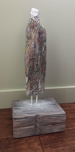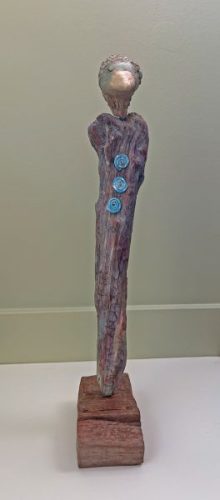 mixed media: driftwood, air dry clay, copper, aluminum wire, waxed linen thread, pencil crayon, acrylic