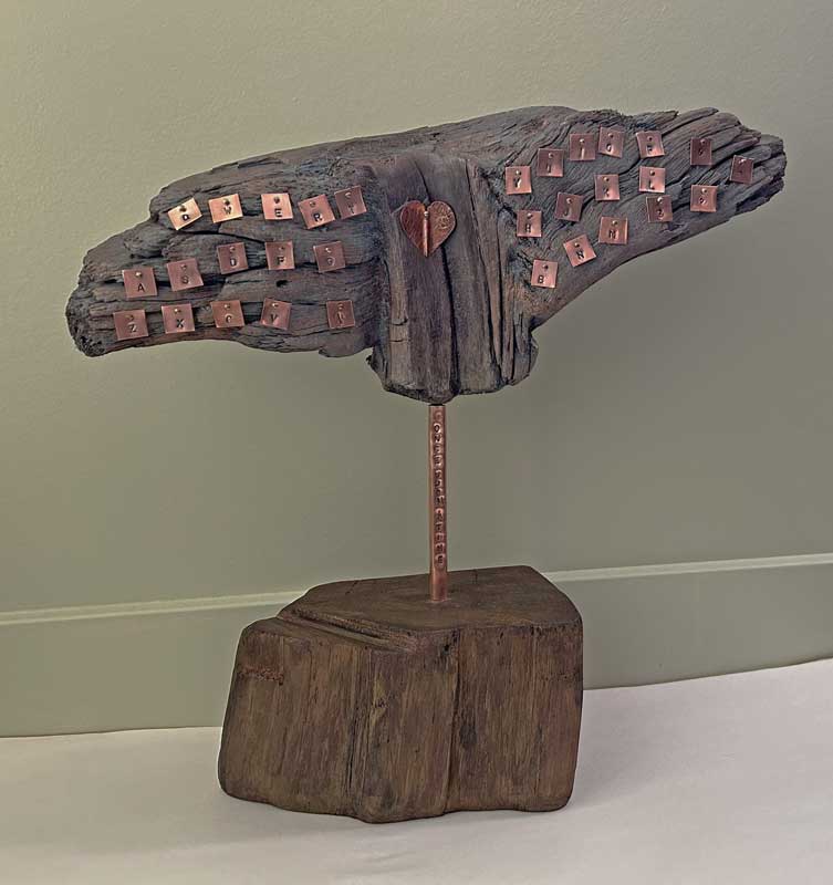 assemblage of found driftwood (hoarded for years) with driftwood base, shaped and stamped copper elements, acrylic and coloured pencils
